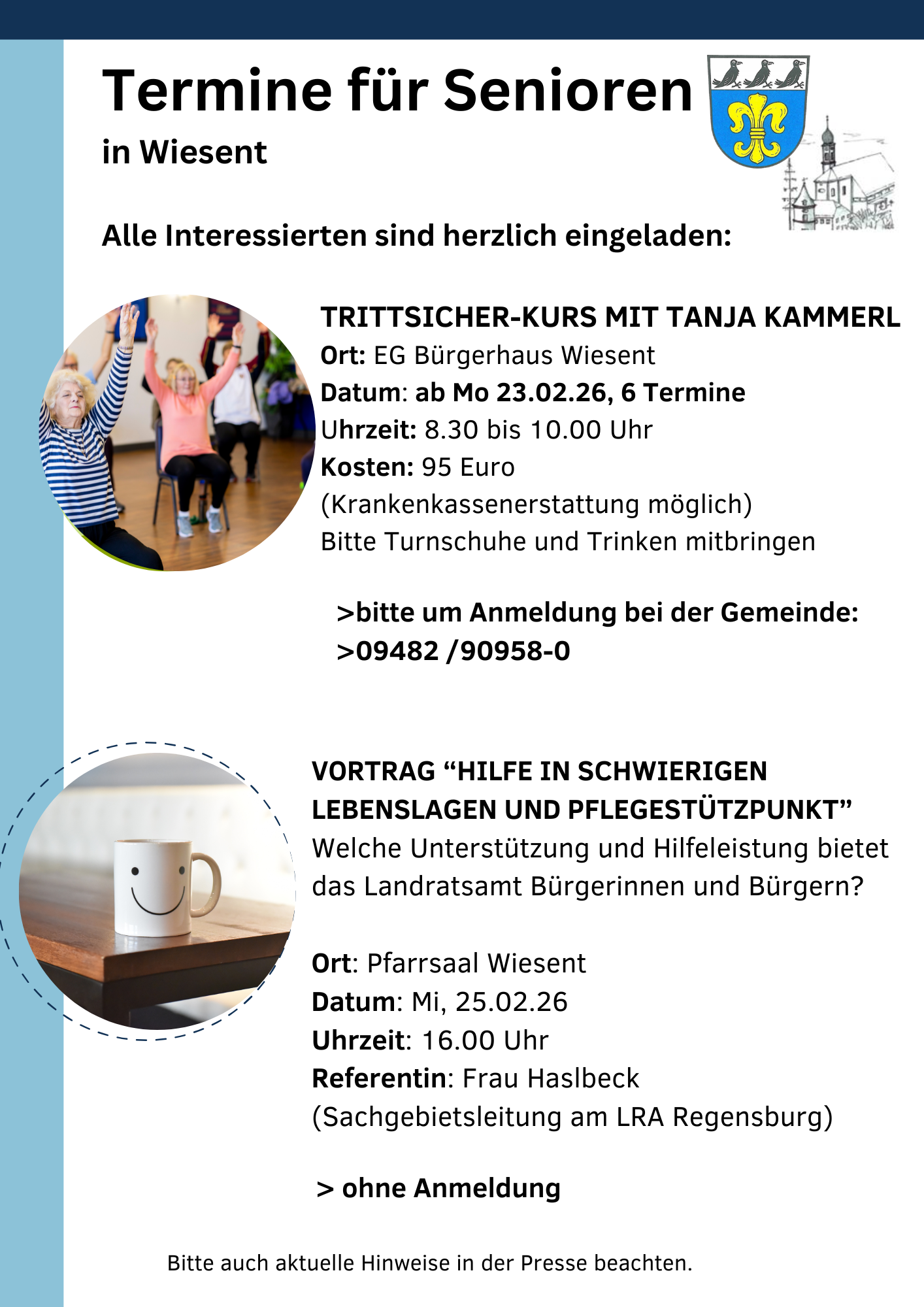 6 Termine, jeweils 8:30 Uhr – 10:00 Uhr, Preis: 95,00 Euro (Krankenkassenerstattung möglich), Anmeldung bei Gemeinde Wiesent, Bezahlung bei Kursbeginn bei Kursleiterin Tanja Kammerl.